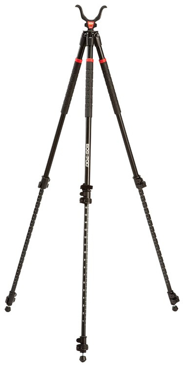 Switcheroo Shooting System lets you easily switch between accessories in the field using the same platform. Three-section, beefed-up, lightweight aluminum legs with matte black finish – 5mm larger leg tube sizes than standard BOG-POD shooting platforms. Universal Shooting Rest with quick-change stem swivels 360° and rubber covered to prevent damage to gun stocks. Custom lever locks with ultra smooth and quiet operation and adjustable tension. Legs adjust independently out to any angle up to 40° with adjustable tension for better control of leg spread. Inch markers on middle leg sections to quickly reach a desired height. All-terrain foot system with rubber feet that screw up to reveal a steel tip for better grip on ice. Use in sitting, kneeling, or standing positions – from 22 inches to 68 inches usable height when legs are spread. Length when closed for carrying is 33 inches. Includes free carry bag and custom allen tool for tension adjustment of lever locks and leg spread. Weighs approximately 56 ounces (3.5 pounds).