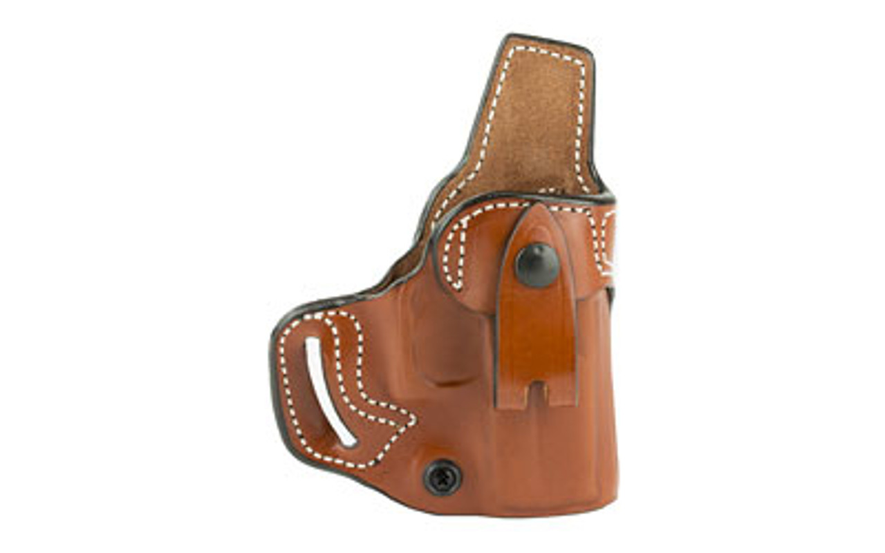 Osprey is a trailing slot OWB/IWB holster built from premium tan saddle leather. The belt slots will fit belts up to 1 1/2″ wide. The IWB strap is “cantable” and easily removed without tools.