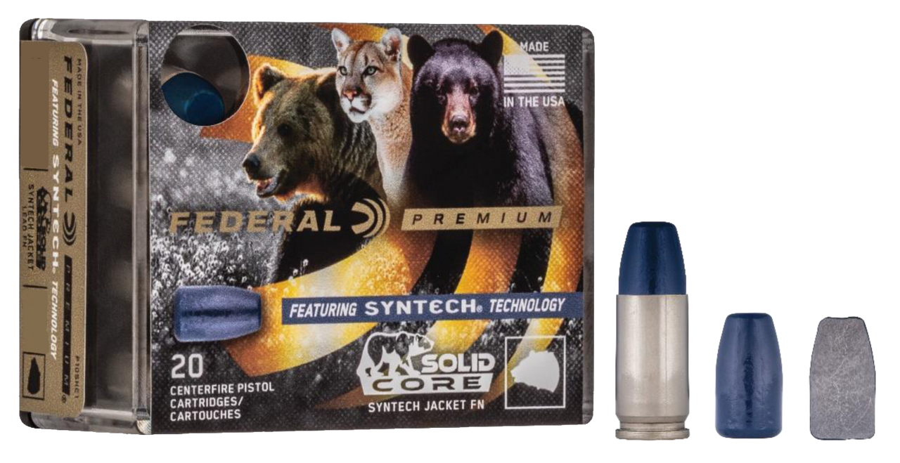 Sometimes wild places can put you in a tight spot. That’s why Federal designed the Solid Core. Its extremely hard, flat-nose lead bullet holds together while blowing through bone, providing high weight retention and deep penetration. Syntech polymer jacket technology reduces the friction and leading that plague hardcast bullets.