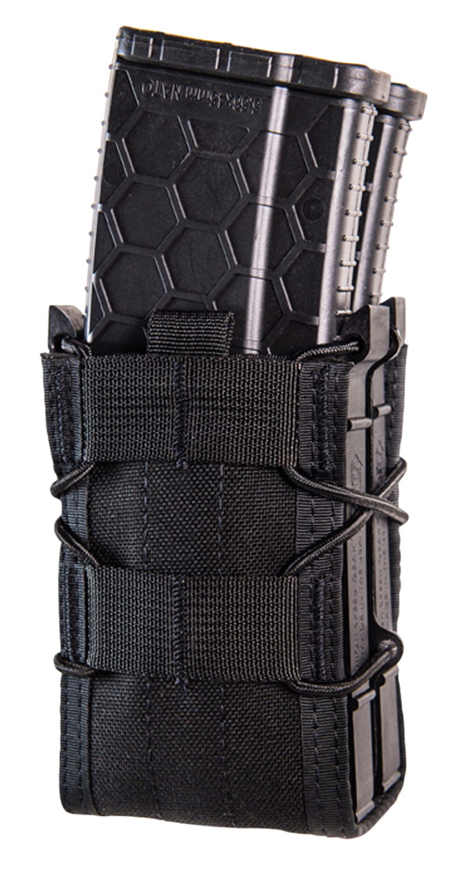 This line of polymer TACOs function much the same as their nylon counterparts. The body and brackets are made with a durable and flexible, proprietary polymer and are laced together with a bungee cord. As with the originals, these pouches grip and retain a wide variety of magazine styles and calibers. It mounts to both MOLLE and belts up to 2″ with High Speed Gear’s universal HSGI Clips, has a pop lock configuration that orients excess bungee down and out of the way, and features grommets for drainage.