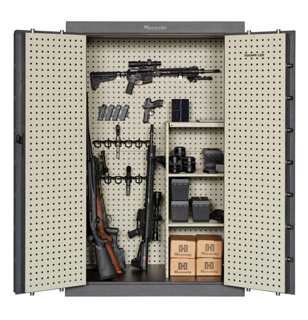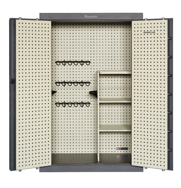 The Hornady 95072 Mobilis Double Door MAX Modular Gun Safe also has a fire rating. It has a 2300 degree F One Hour Fire Shield protection and heat-activated door seals to protect your firearms and other belongings from a fire. Inside features a Square-Lok interior organizing system with shelves on the right and rifle/handgun racks on the left which helps maximize storage space. These are configurable to your preferences. There is plenty of room at the top for a rifle stored vertically or other items. Square-Lok accessories can also be used on both doors for additional storage. You can purchase additional Square-Lok accessories to help with organization.