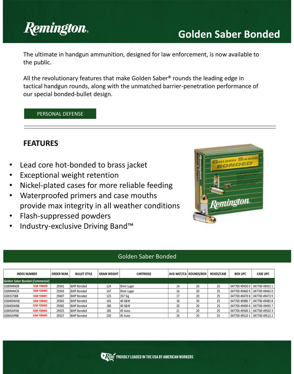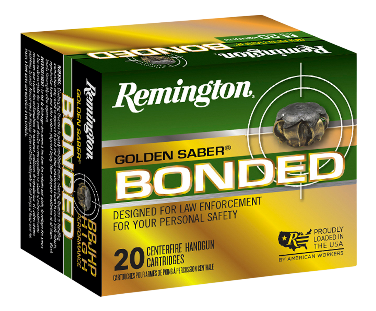 The Golden Saber Bonded features Remington’s special bonded-bullet design, bringing unmatched expansion, weight-retention, and barrier-blind performance. The lead core is hot-bonded to brass jacket, while the reduced bullet nose diameter is ideal for precise bore alignment and match-grade accuracy. Jacket stiffness and wall thickness optimized to eliminate over-expansion.