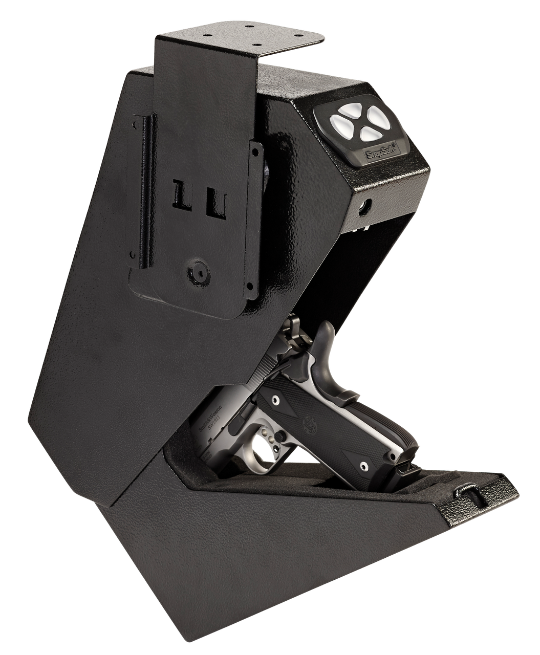 SnapSafe’s Drop Box compact vault mounts under a counter or desk, or on the side of a nightstand for quick access to your handgun. It features a programmable 4 to 6 digit keypad, fast action, tamper resistant drop-down door, and a protective foam liner safeguards your handgun from scrapes and scratches. This model is constructed of 16-gauge steel for exceptional durability and the mounting bracket allows multiple orientations.