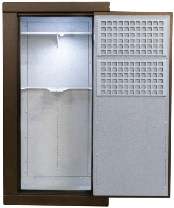 Built with uncompromising security, the Steelhead Rustic Nomad 32 features a double-wall construction with robust 12-gauge welded, powder-coated exterior panels and 20-gauge interior panels. The seven-gauge plate door (3/16″) offers top-tier protection. The safe also features a patented panel construction that includes dual-stage fire protection with 2300-degree insulation and radiation-reflecting panels, eliminating concerns about trapped moisture and corrosion. The Palusol heat-activated expanding door seal and an integrated cold smoke seal further enhance its fire-resistant capabilities.