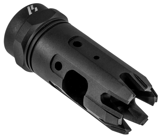 The Strike Industries Mini King Comp 9mm brings the proven performance of the full-size King Comp in a more compact, lighter package designed exclusively for 9mm carbines. The Mini King Comp retains the full range of features of the King Comp in a single chamber format. The large single baffle captures the vented gasses for recoil mitigation. The redirection jets work to stabilize the muzzle end for faster follow up shots while dampening felt concussion on the shooter end to maintain the pleasant shooting characteristics of 9mm carbines. The end of the compensator features the crown of standoff/wire cutting tines that gives the compensator its name.