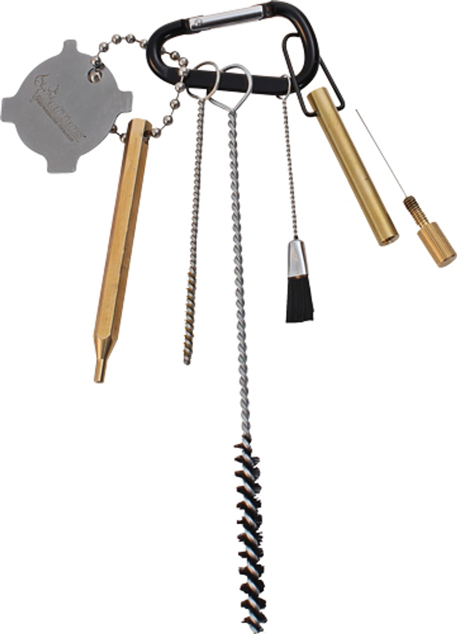 Traditions Flintlock Tool Kit is perfect for all flintlock users both in the field and at the range. The carabiner attaches easily and securely to a belt loop, backpack, or range bag and comes with 6 essential items flintlock shooters require.
